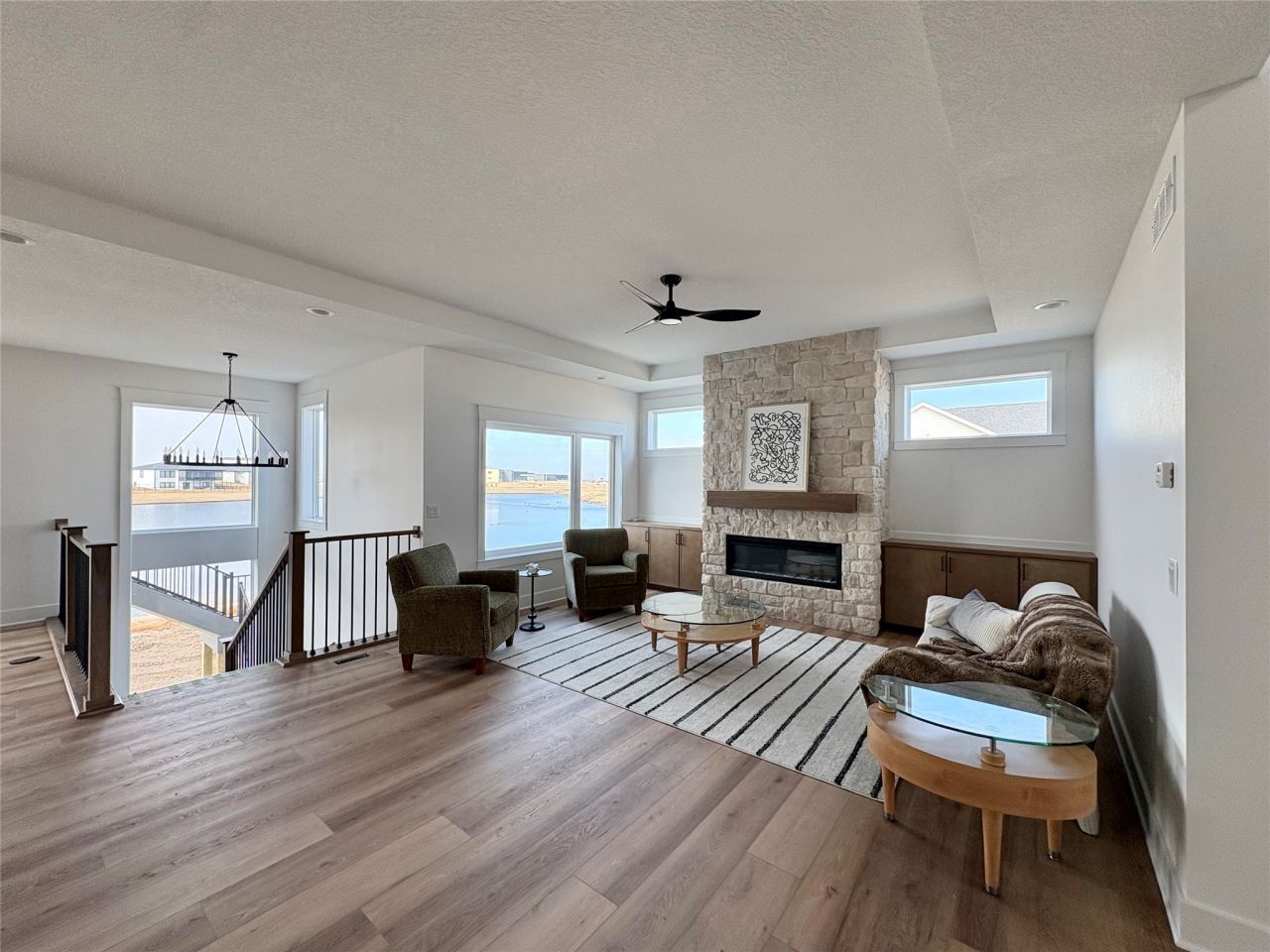 Stunning 4-Bed, 3-Bath Home on a Beautiful Pond Lot in Waukee! This exceptional home offers over 3,000+ sq. ft. of beautifully finished living space in a sought-after Waukee neighborhood. Designed with both style and functionality in mind, this home features a high entry shed roof with and an abundance of storage throughout. The main level boasts LVP flooring in the living areas and a striking full stone fireplace with built-ins creating a bright and inviting space. The open-concept chef's kitchen features a gas stove with a hood vent, a walk-in pantry with built-in cabinets and quartz counters, and a spacious layout perfect for entertaining. The primary suite featuring a custom tiled shower with a frameless glass door. Step outside from the main level onto a composite covered deck, offering the perfect spot to relax and enjoy the pond. The walkout lower level is built for entertainment and comfort, featuring oversized windows, a walk-up bar with space for a full refrigerator and a second stone fireplace for a cozy ambiance. A beautiful open turned staircase leads to a stunning space, which opens to a large patio, perfect for outdoor living to enjoy the pond. Additional highlights include a laundry room with lockers/closet/ and sink, a fully sodded lot with irrigation. Don't miss this incredible opportunity to own a luxurious home in a prime location. Walking distance to schools/parks. All information obtained from seller and public records.