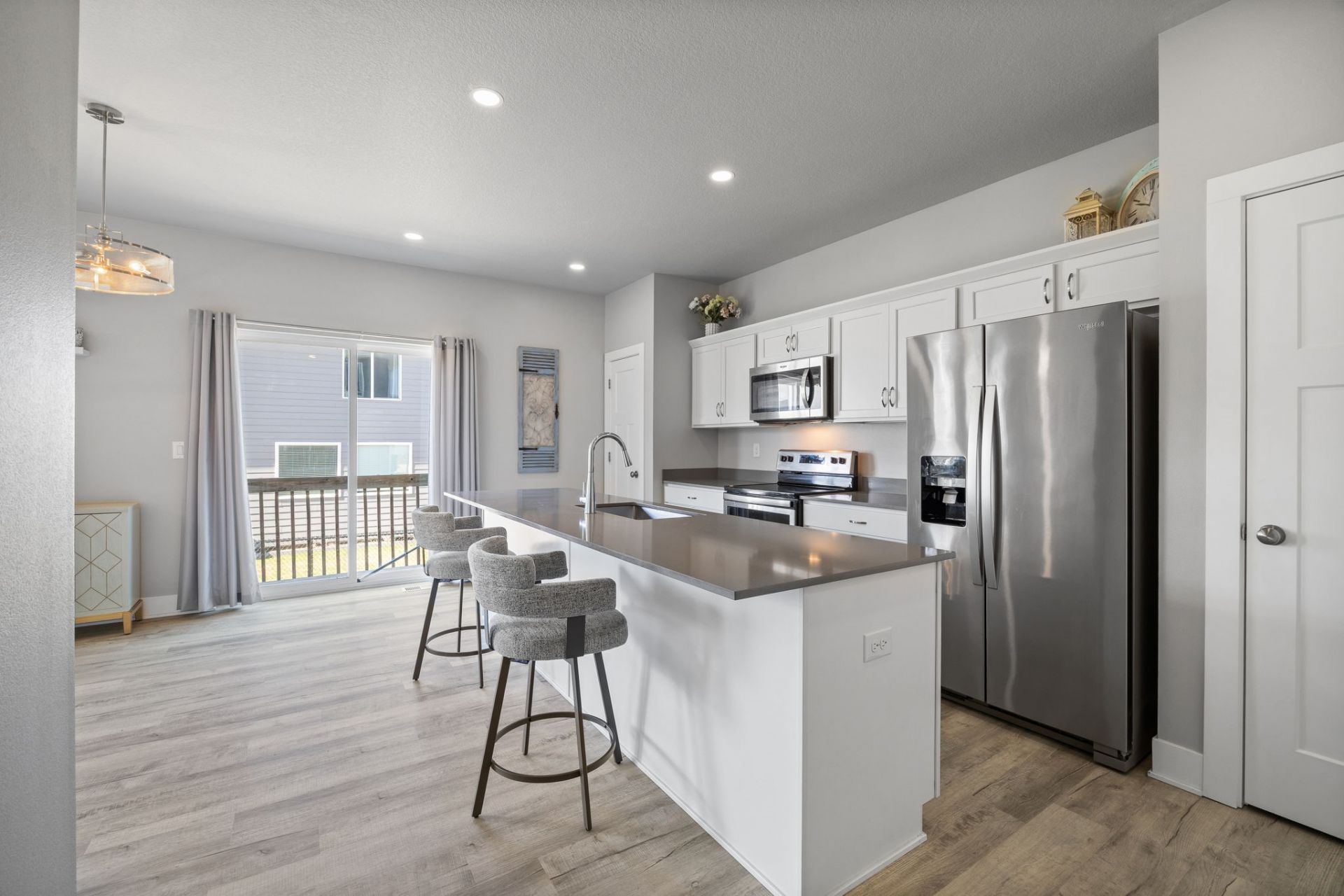 Built in 2019, this stylish two-story home blends modern finishes with thoughtful design throughout. Featuring 3 bedrooms, each with its own walk-in closet, including a spacious primary suite complete with an ensuite bath, large walk-in closet, and private access to a second-story covered balcony overlooking the front of the home. The main level offers an open-concept layout with tall ceilings, an electric fireplace, and a beautifully appointed kitchen showcasing gray quartz countertops, white cabinetry, two pantries, and an extra-long island with ample seating?perfect for entertaining. All appliances stay for added convenience. Upstairs includes a nice loft area perfect for office or gaming, you'll love the ease of second-floor laundry along with well-sized secondary bedrooms. The unfinished basement provides excellent potential for future finish, featuring an egress window for a possible fourth bedroom and plumbing stubbed for an additional bathroom. Complete with a two-car attached garage and low maintenance yard, this home offers space, style, and room to grow.