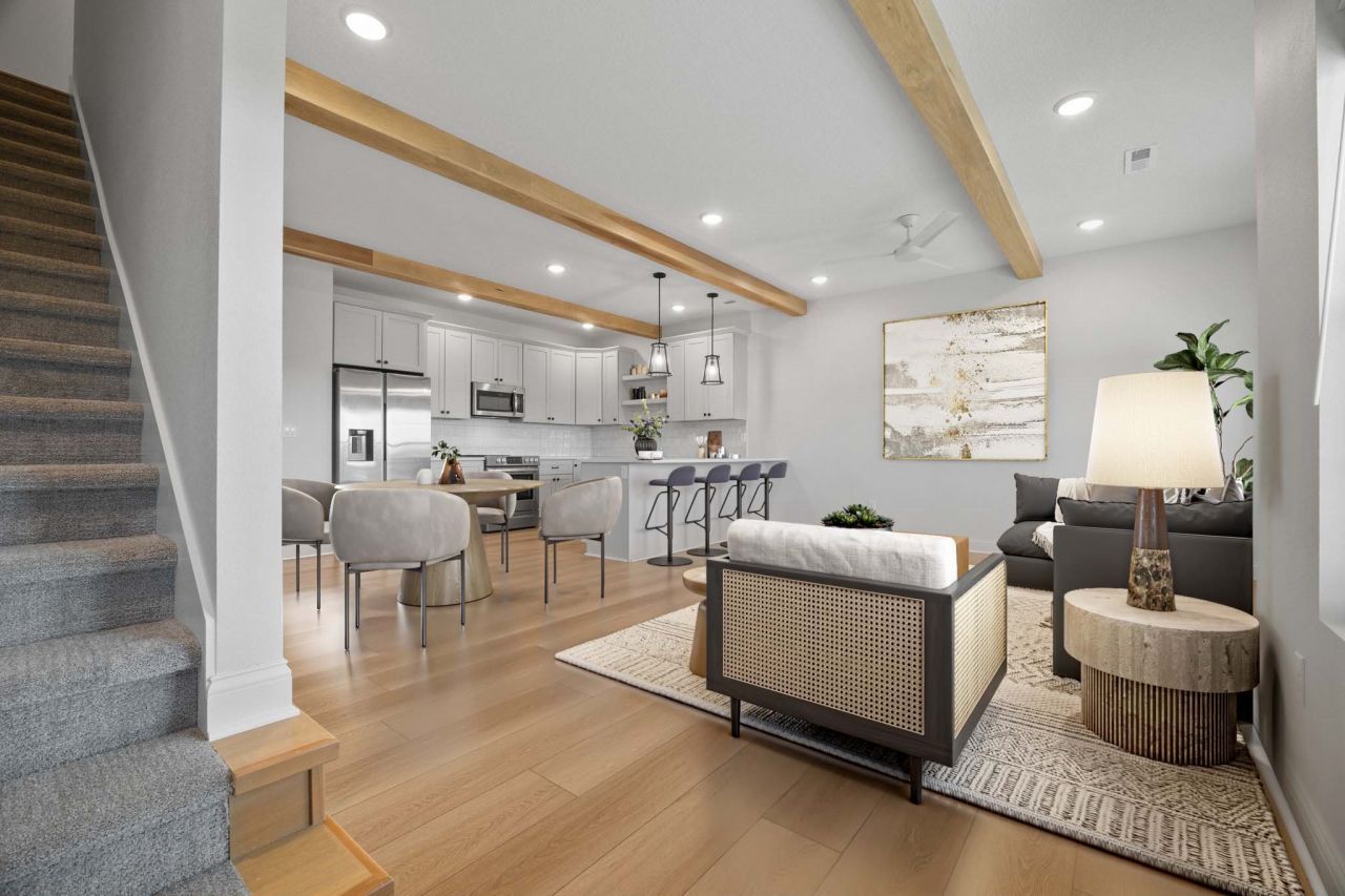 This thoughtfully designed townhome in Calusa at Timberline Village offers a refined blend of modern finishes and functional living spaces. The open-concept main level is ideal for both everyday living and entertaining, featuring a well-appointed kitchen with quartz countertops, custom cabinetry, stainless steel appliances, and pantry.The spacious living area is enhanced by 9-foot ceilings and abundant natural light, along with a convenient half bath and an organized drop zone located just off the oversized two-car garage.Upstairs, the primary suite provides a private retreat with dual quartz vanities, a tiled walk-in shower, and a generous walk-in closet. Two additional bedrooms and a dedicated laundry room on the upper level add comfort and practicality. Quality craftsmanship is evident throughout with luxury vinyl plank flooring, custom trim work, and upgraded carpeting. Pet-friendly and renter-friendly, this property offers flexibility for homeowners and investors alike. Conveniently located near shopping, dining, and everyday amenities with easy access to major routes. Ask about available 100% financing options.