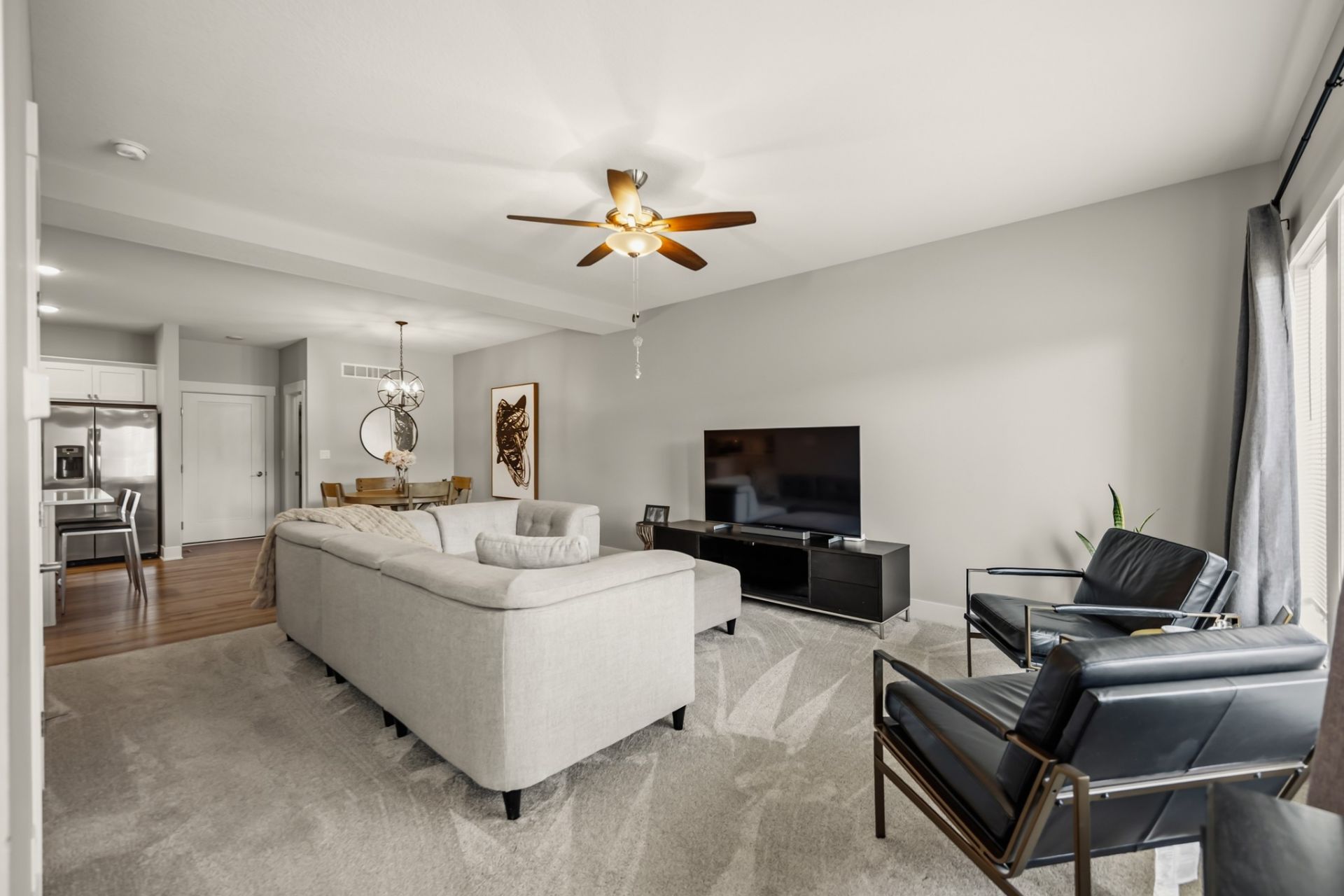 END UNIT TOWNHOME. Welcome to this well-maintained end-unit townhome in a prime Clive location near Shuler Elementary! Featuring 3 bedrooms and 2.5 bathrooms, this two-story home offers 1,864 sq ft of comfortable living space. The open and functional layout is perfect for both relaxing and entertaining. The main level offers a large kitchen with quartz countertops, tile backsplash, walk-in pantry, stainless-steel appliances, and large dining space. A wonderful living room is open to the kitchen and dining area. A half bath completes the main level. Retreat upstairs to the large primary bedroom with large windows desk/reading nook area, and ensuite bathroom with dual vanity. Two additional bedrooms, full bathroom and laundry room complete the 2nd floor. The unfinished basement provides excellent potential for future finish or extra storage. Enjoy the ball fields and playground of Shuler Elementary and easy access to the Clive Greenbelt trail. Schedule your tour of this End-Unit Townhome today!