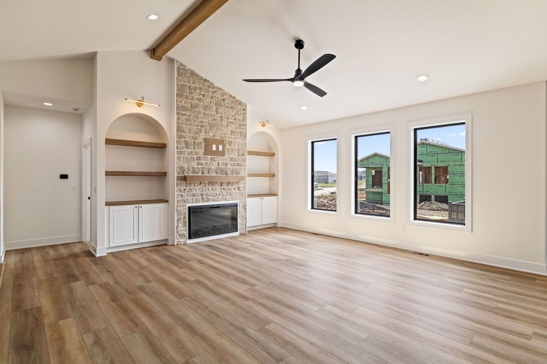 This Genuine Homes new construction is a true statement in design & craftsmanship, where every detail has been carefully considered to create a home that feels both striking & timeless. A grand double door entrance sets the tone, leading into a space defined by graceful archways, curated finishes & elevated architectural detail. The gourmet kitchen is a true showpiece, featuring Café Series appliances, quartz countertops, & an expansive walk in pantry designed for both beauty & function. The primary suite offers a private retreat with its own fireplace & striking accent wall, along with a beautifully designed ensuite featuring a walk in shower & a grand closet with custom organization. A second ensuite bedroom on the main level adds flexibility, while the laundry room, mudroom, & a well placed half bath complete the space. The lower level continues to impress with a spacious family room, an additional fireplace, & a wet bar perfect for entertaining. Two generously sized bedrooms with custom closet shelving & a full bathroom provide ample space for guests or everyday living. Daylight windows fill the lower level with natural light, while a tucked away office, framed by archways & featuring a hidden room, adds a unique & memorable touch. Outside, a fully screened covered deck with its own fireplace creates the perfect setting to relax & unwind. Additional features include dual zoned HVAC, a large storage area, irrigation system, & an epoxied three car garage with a 220 outlet.
