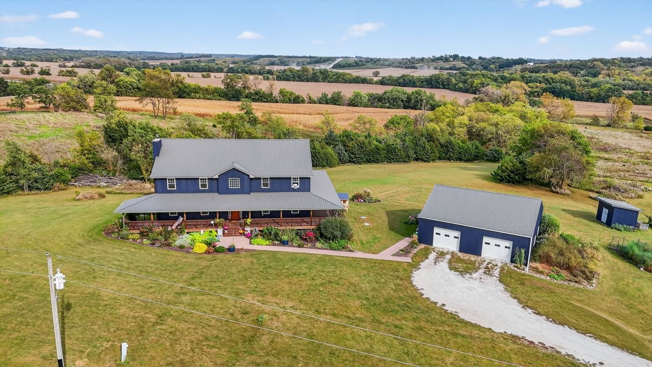 You will love this gardener's dream just 22 minutes south of Mills Civic Pkwy. This nearly 7-acre homestead features a 40x40 garage/outbuilding, 12x12 garden shed, fruit trees, asparagus, berries, herbs, plenty of garden space for spring and summer vegetables, and lush perennial beds. This home is spacious with over 4800 sq ft of finished space and a wraparound porch perfect for sunrise, sunset, or taking in the amazing views! The kitchen is a cooks dream, with large appliances, quartz countertops, large walk-in pantry, and plenty of cabinets and storage. The main level has massive ceilings, wood stove in the living room, dining area, and huge mudroom with laundry and utility sink. The 1st floor primary bedroom has french doors that walk out to the wraparound porch, 9 ft ceilings, walk-in closet with custom shelving, and a private bath featuring a walk-in tiled shower and double sinks. Main level also has a second bedroom/office and charming bath. Upstairs has a loft and three spacious bedrooms with more generous closets, a full bath, and is wired for zone heating. The walk-out basement offers two more bedrooms, reclaimed finishes of barn wood and tin, and potential for an apartment or in-law suite with private entrance and patio. Geothermal heating and cooling too! Call today to make this Home Sweet Home!