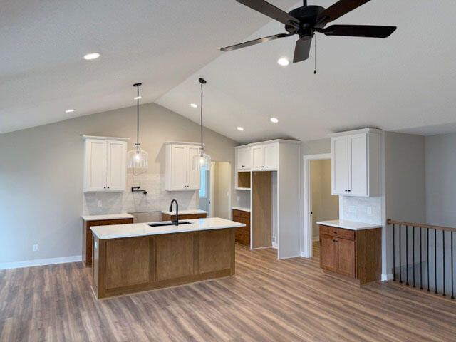 Beautifully designed home featuring an open-concept main level with laminate floors, and a cozy fireplace. The kitchen offers a large island, tile backsplash, and built-in appliances. The primary suite includes a tiled shower, double vanity, and walk-in closet with convenient laundry access. Two additional bedrooms and a full bath complete the main floor. The finished lower level adds a spacious rec room with wet bar, two bedrooms, and full bath