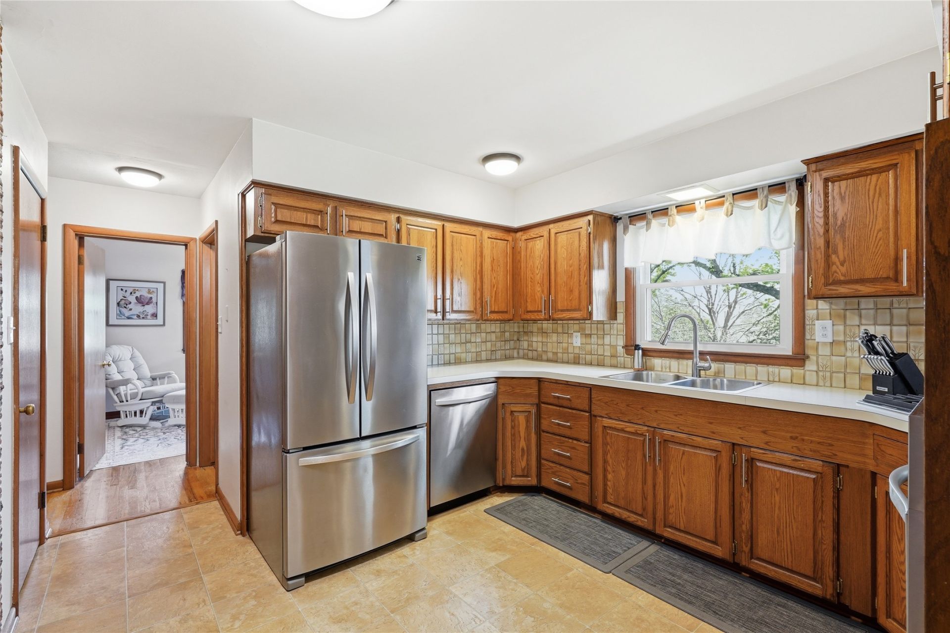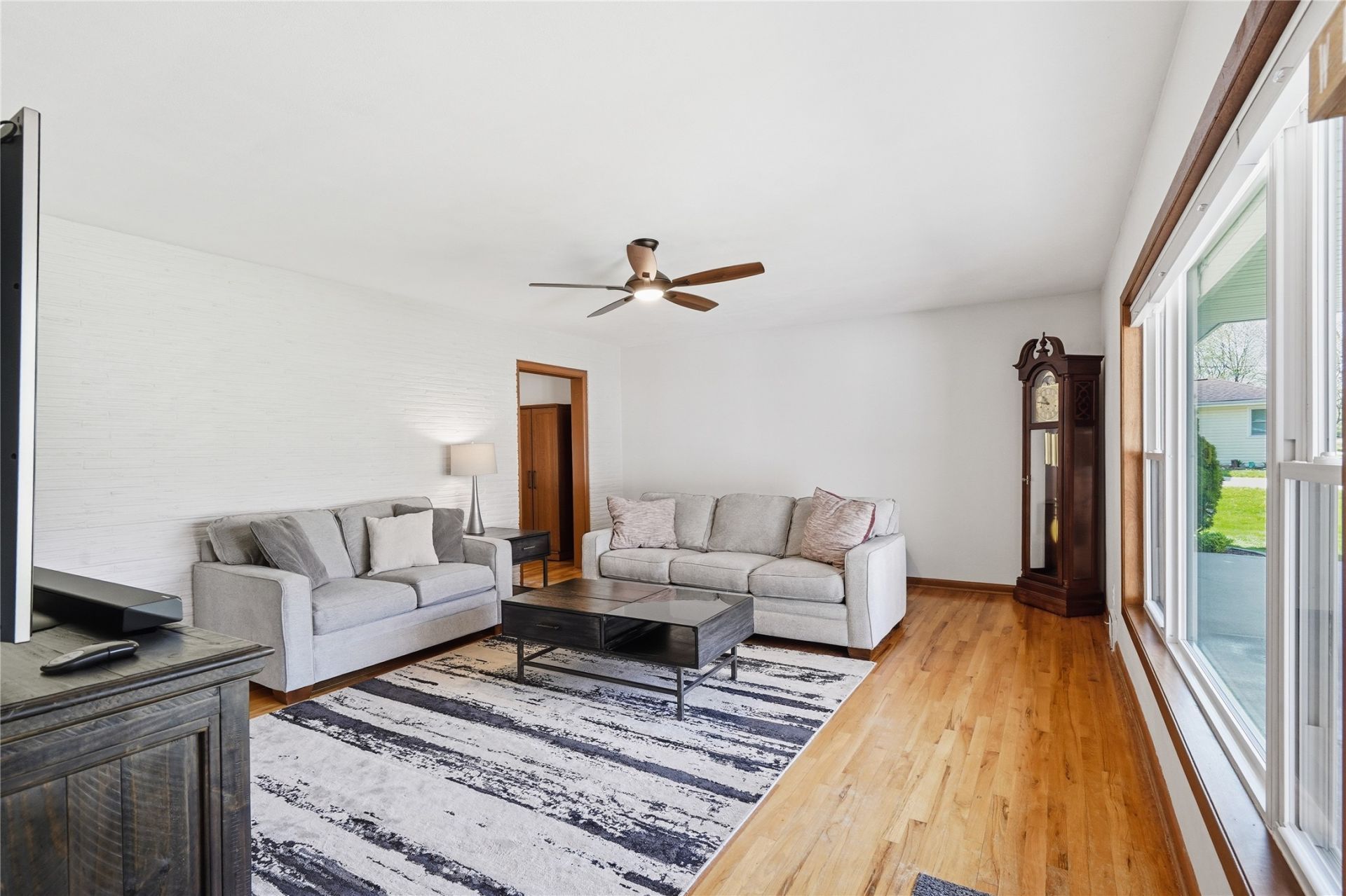Nestled on a quiet cul-de-sac, this ranch-style home offers a spacious setting on nearly half an acre lot, providing a rare amount of outdoor space. The main level features three bedrooms, including a generously sized primary bedroom with an ensuite half bath, along with an additional full bathroom. The living area showcases hardwood floors and a striking brick accent wall, adding warmth and character to the space. The layout flows into the kitchen and dining area, with access to a sunroom, as well as a deck and patio - offering a variety of options for everyday living and gatherings. The walkout lower level expands the living space with a fourth bedroom, additional finished area, and two separate access points to the backyard, allowing for flexible use. An attached two-car garage provides added convenience. From the driveway, enjoy a clear vantage point for local Fourth of July fireworks show and fishing across the street in Lake Halice - added seasonal highlights of the location. New siding + windows in 2019 and new gutters + roof as of 2021. This property combines functional living space, distinctive features, and a sizable outdoor setting, all within an established Urbandale location.