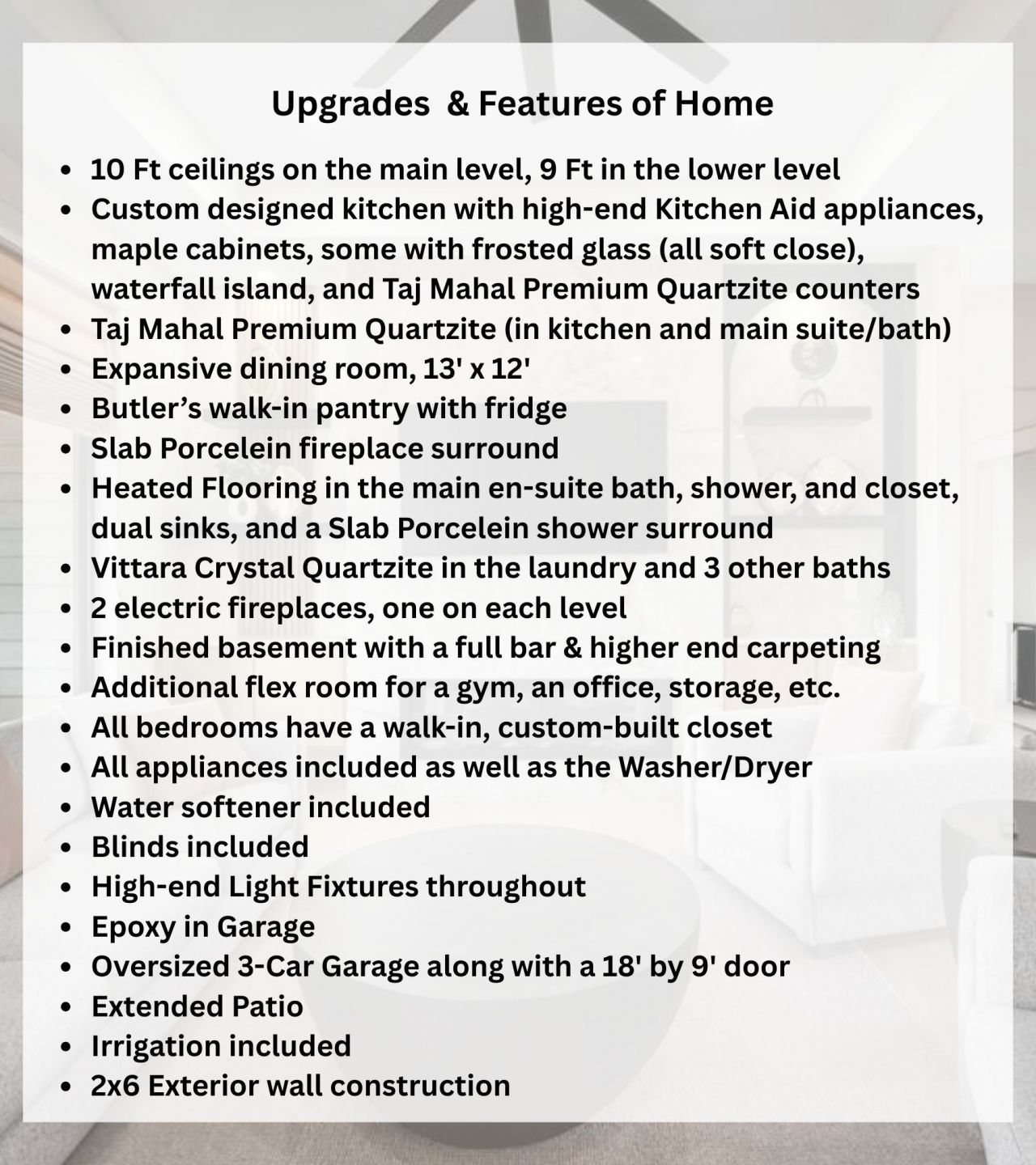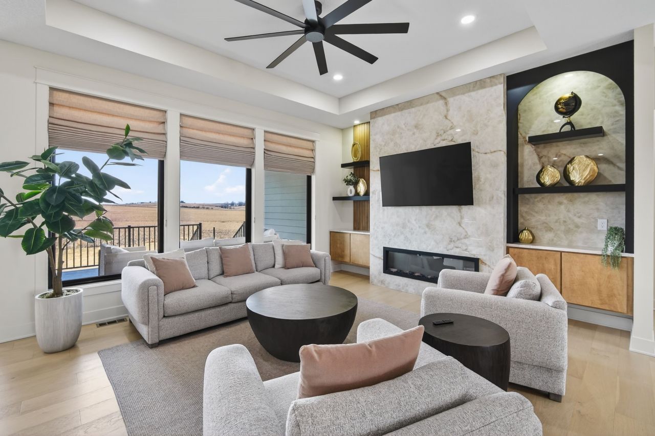 Nearly 4,000 sq ft of luxurious finished space in Grimes within sought-after Johnston Schools! This stunning ranch offers 6 bedrooms, 4 baths, and elevated finishes throughout. The custom kitchen features high-end appliances, maple cabinetry with soft-close drawers, waterfall island, Taj Mahal Premium Quartzite (in kitchen and main suite/bath), frosted glass cabinets with lighting, modern hood, and a spacious butler's pantry with fridge. Expansive dining area and living room showcase 10' ceilings and a porcelain fireplace surround. Two fireplaces (one on each level) add warmth and style. The finished lower level includes a full bar, high-end carpeting, 9' ceilings, and additional flex space for a gym, office, or storage. All bedrooms offer custom walk-in closets. The primary suite includes heated floors in the bath, shower, and closet, dual sinks, and a porcelain shower. Covered deck, mudroom, walk-in laundry with sink (washer/dryer included), water softener, high-end blinds and lighting, and an oversized 3-car garage with upcoming epoxy flooring (Vittara Crystal Quartzite in the laundry and 3 baths). Situated on nearly 1/3 acre! All information obtained from seller and public record.