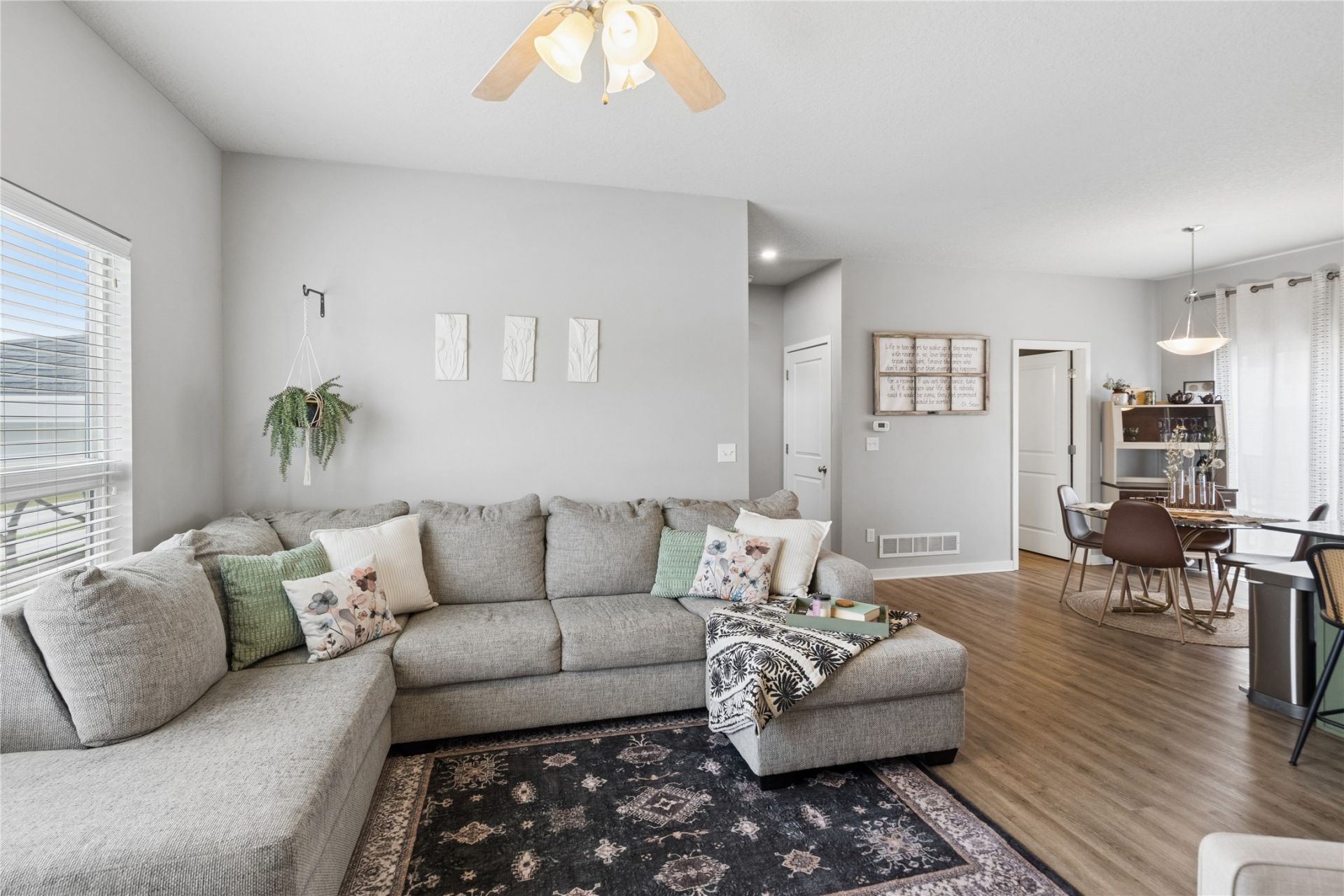 Move right in and enjoy low-maintenance living in this updated 2-story townhouse in a great Grimes location. Fresh paint, painted cabinets, updated backsplash, new LVP flooring, and a refreshed fireplace with new insert and shiplap give the main level a clean, modern feel. The open layout offers great natural light and easy flow to the dining area and kitchen, plus deck access for grilling or relaxing. Washer and dryer stay, and new window and patio door screens add to the move-in ready appeal. Upstairs features two spacious bedrooms with vaulted ceilings, each with a private bath, plus convenient laundry and new carpet on the stairs. HOA covers exterior, snow, and lawn care. Located along the bike trail with quick access to I-35/80 and close to new Grimes restaurants and shops, all on the edge of town with minimal traffic.