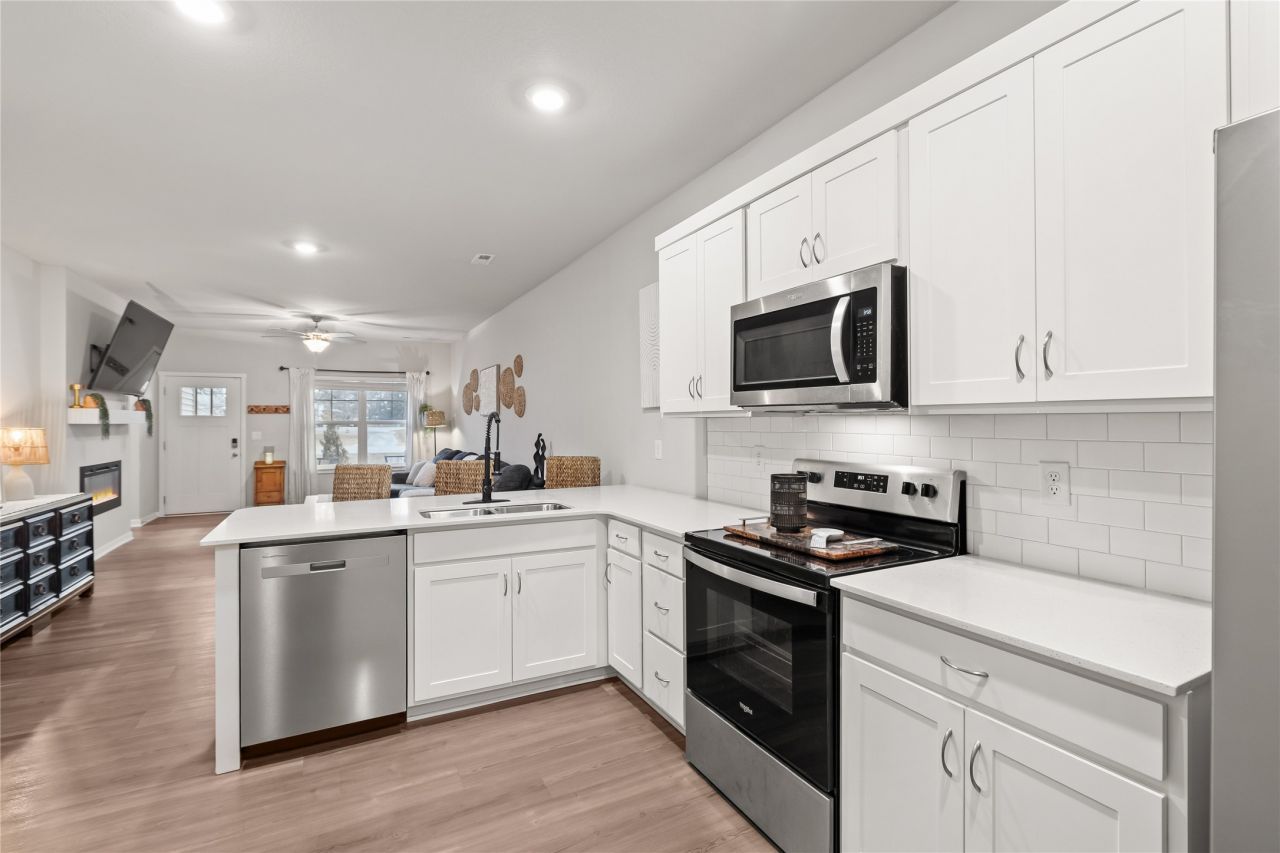 Welcome home! Step inside to a bright, open-concept layout designed for comfortable living and effortless entertaining. The spacious living room welcomes you with a cozy electric fireplace and stylish mantle, creating the perfect focal point. Just beyond, the kitchen shines with quartz countertops, a beautiful tile backsplash, and seamless flow into the dining area. Tucked near the rear entrance, you'll find a thoughtfully designed mudroom that connects to the two-car garage. Just off the kitchen, enjoy the dedicated laundry room with washer and dryer space for everyday convenience. Down the hall are two bedrooms, including a spacious primary suite featuring a large walk-in closet and private ensuite bath with matching quartz countertops. A nearby linen closet adds practical storage without sacrificing space. The home also includes a security system for added peace of mind. Enjoy access to community amenities including a swimming pool, pickleball court, and clubhouse, while the HOA covers snow removal and lawn care for truly low-maintenance living. Move-in ready and waiting for you! All information obtained from seller and public record.