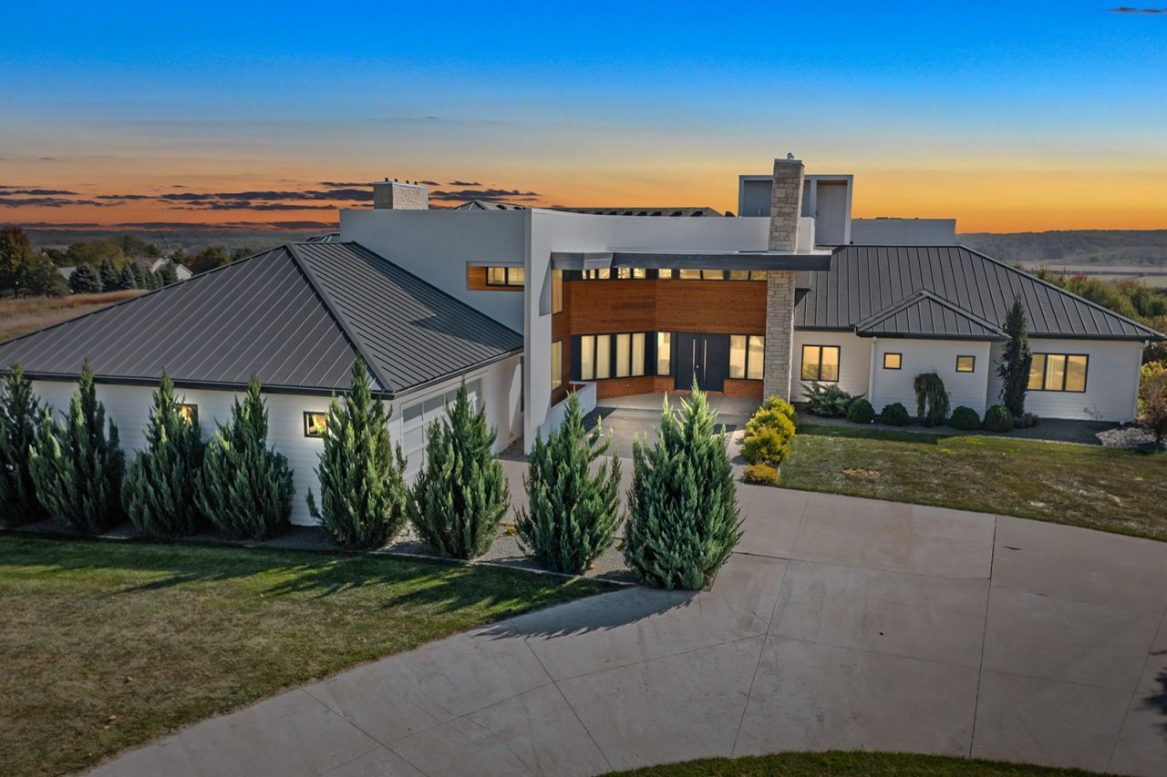 Napa Valley?inspired contemporary walk-out ranch offering 11,364 sq ft of luxury living on 5.4 acres with panoramic views. This one-of-a-kind home features 5 bedrooms with private en suites and 7 total bathrooms. The main level showcases a stunning great room with floor-to-ceiling windows, a fireplace, projector, and drop-down screen, creating the perfect space for entertaining. The chef's kitchen includes high-end appliances, a large island, and a spacious walk-in pantry, along with a generous dining room. Additional main-level features include a mudroom with built-ins, office, laundry room, toy/play room, and heated floors throughout. The primary suite offers vaulted ceilings, a fireplace, an oversized walk-in closet, soaking tub, walk-in shower, and dual sinks. The walk-out lower level features an open staircase leading to a second family room, wet bar, wine cellar, exercise room, sauna, and private theater room. Located in a gated community with amenities including a pool, pond, and playground, this home has also been recently updated with a metal roof, life-proof composite decks, fresh exterior paint, new gutters, and a rooftop hangout space?making it truly exceptional.