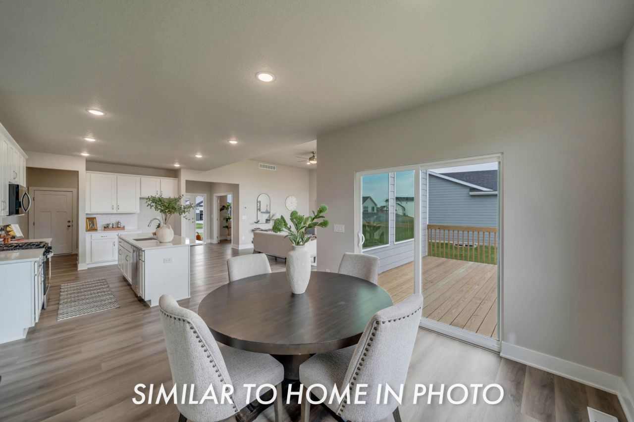 Destiny Homes presents the Belle floor plan in Grimes' Hope Meadows on a daylight lot with POND view and large covered deck. This spacious, flexible 1.5 story floor plan has just over 2600 square feet, 4 bedrooms and 2.5 bathrooms. The main level features LVP flooring that connects the great room, kitchen, and dinette, creating a welcoming space. The switchback staircase with a large window and spindles opens up the area and lets in the beautiful sunlight. The kitchen includes a large island, electric cooktop, build in oven, vented range hood, tile backsplash, soft close cabinets, walk in pantry, and ample cabinetry for storage. A private primary suite is conveniently located on the main floor, with a generous walk-in closet, tile shower and dual vanities in the bathroom. You'll also find a dedicated office near the front entry, a drop zone with built-in bench, and laundry space just off the garage entrance. Upstairs offers three additional bedrooms each with its own walk-in closet, a full bath with double sinks, and a spacious loft area perfect for a second living room, play space, or homework zone. Located just south of Dallas Center Grimes High School. Enjoy all the great amenities that Grimes has to offer within just minutes. Ask about $2,000 in closing costs provided by preferred lender. All information obtained from seller and public record.