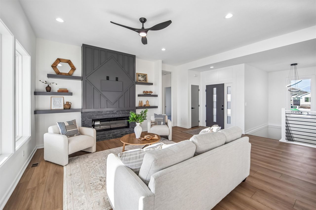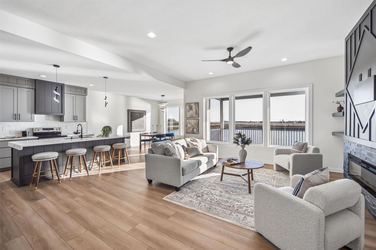 Welcome to this stunning 6-bedroom walkout ranch situated on a 0.29 acre lot with serene pond views! The main level offers an open-concept layout: a spacious living room with 10' ceilings, an electric fireplace, and abundant natural light is perfect for everyday living and entertaining. The kitchen boasts a center island, soft-close dovetail cabinets and drawers, GE appliances, a walk-in pantry with built-ins and convenient garage access, and flows into the dinette with a door leading to the oversized covered deck. The main level also includes two bedrooms and a full bath with tile surround and flooring, plus a primary suite featuring a tray ceiling, double vanity, tiled shower, tile flooring, and a walk-in closet. A drop zone and laundry room add functionality. The walkout lower level expands the living space with 9' ceilings, a large family room featuring a wet bar and second electric fireplace, three additional bedrooms, and a full bath with tile surround and flooring. Additional features include quality 2x6 construction, rounded drywall corners, LVP flooring throughout living areas, and Vector casement windows. All information obtained from seller and public records.