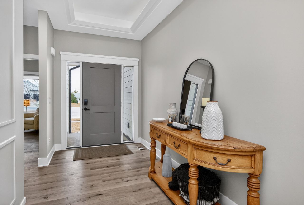 Come see this 5 BR ranch home NW Ankeny in Kidman Estates.This stunning home offers over 2,700 sq ft of finished living space, 5 bedrooms, and 3 full bathrooms. A welcoming entrance with tray ceilings and plenty of room to greet guests, with 2 BR and a full bath off of the foyer. Great home for entertaining in this open layout . The eat-in kitchen features a big walk-in pantry to keep you organized. The main living room showcases a stone fireplace, vaulted ceilings, neutral finishes., and big windows letting in lots of natural light. The primary suite includes a tray ceiling, French doors to a spa-like bath with tiled shower, double vanity, and a walk-in closet. The lower level is finished with lots of living space, a wet bar and dining island, 2 more bedrooms, a full bath, plus lots and lots of storage. A flex room for exercise or more storage. Enjoy more living space outdoors with a covered deck, a patio for your fire pit, and privacy fence around your big yard. Heated garage with epoxy floors. Located near the new elementary school, splash pad, and the park. Close to Saylorville Lake for even more outdoor recreation.
